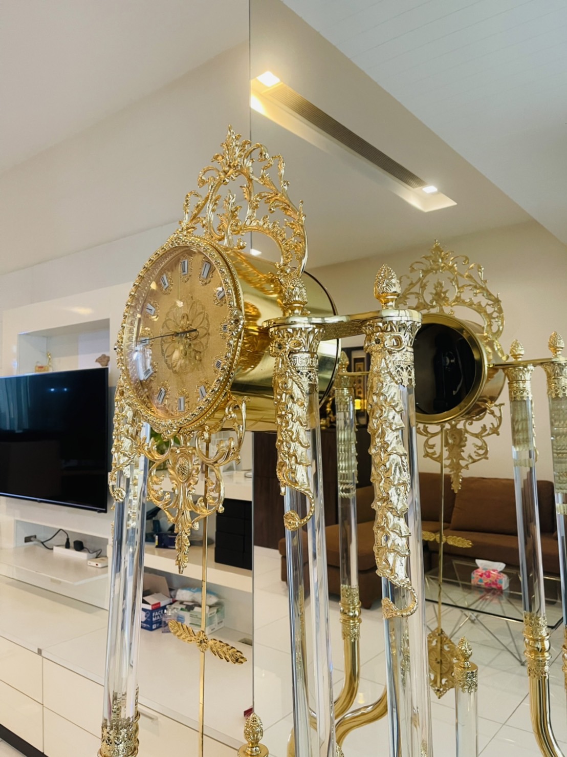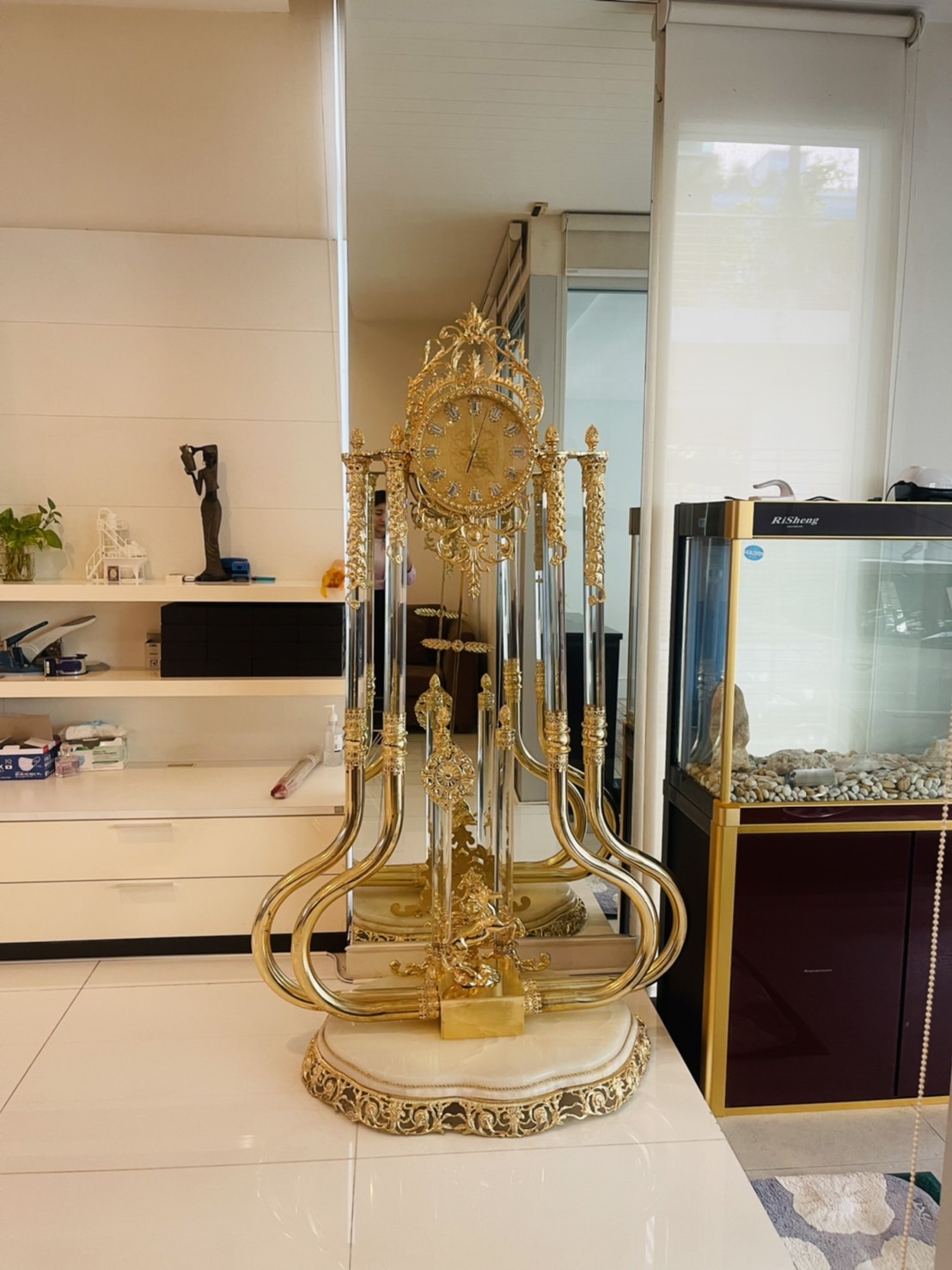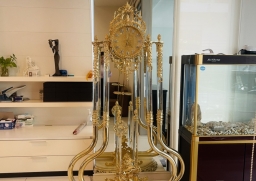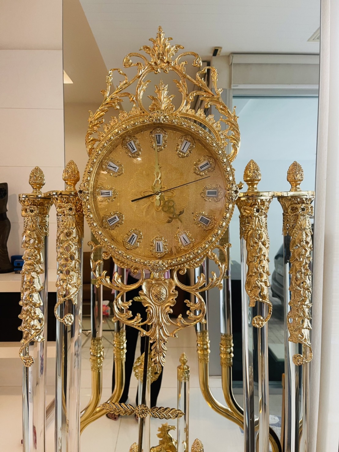 นาฬิกาตั้งพื้นทองเหลืองทรงยุโรป ผลิตด้วยโลหะทั้งเรือนไม่ใช่พลาสติก ตัวเรือนทำจากทองเหลือง ฐานเป็นหินอ่อน ขาตั้งเป็นทองเหลืองและคริสตัล นาฬิกาเป็นระบบใส่ถ่านขนาด 1A 2 ก้อน เมื่อครบ 1 ชั่วโมงจะมีเสียงเตือน 1 ครั้ง มีไว้ทำให้บ้านหรือสำนักงานของคุณสง่างามและหรูหรา