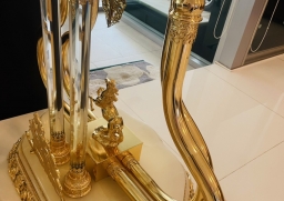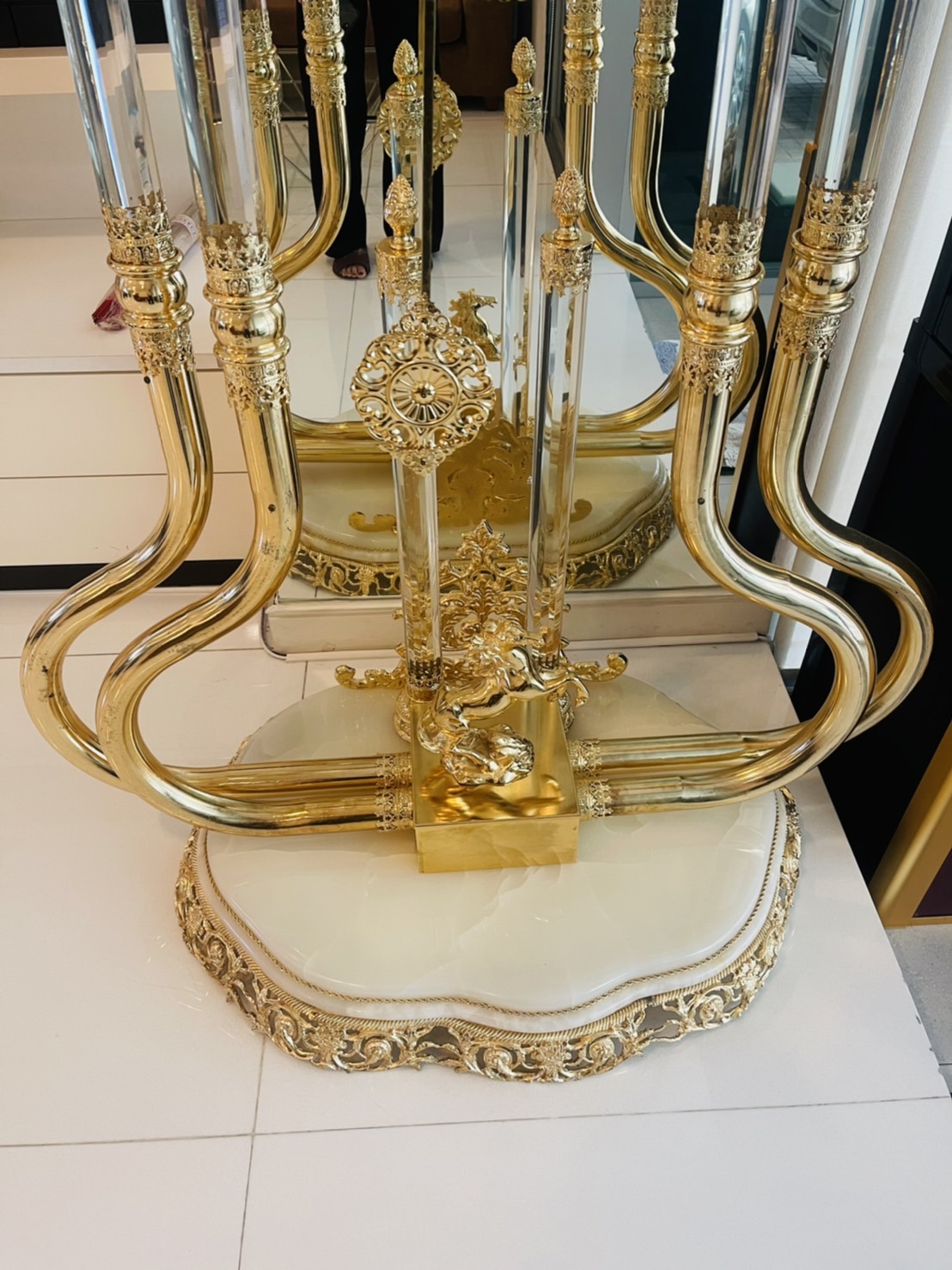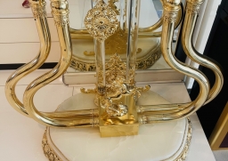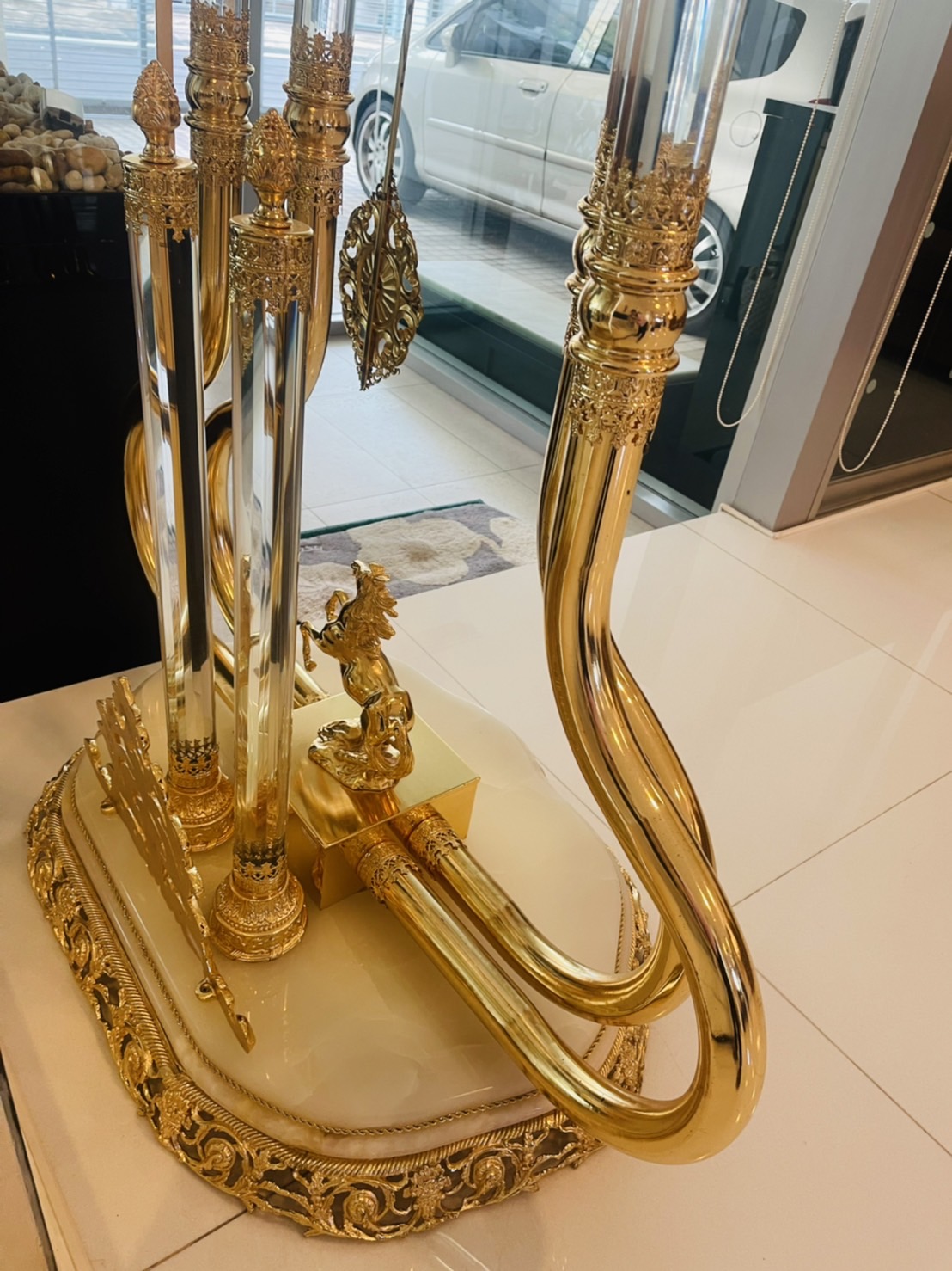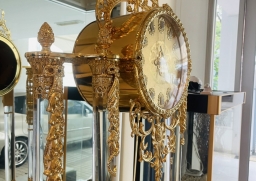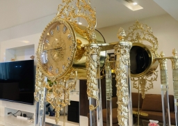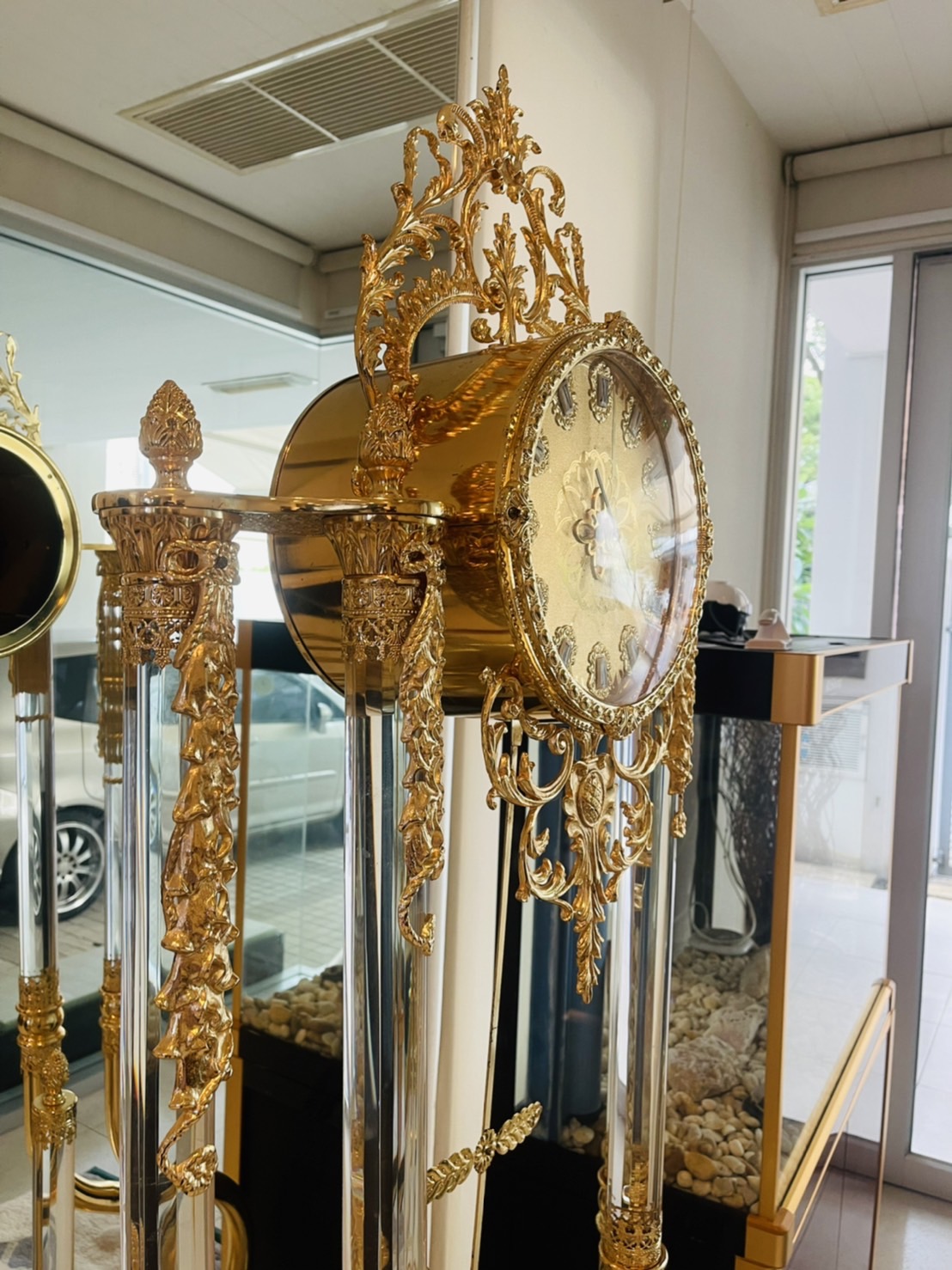 นาฬิกาตั้งพื้นทองเหลืองทรงยุโรป ผลิตด้วยโลหะทั้งเรือนไม่ใช่พลาสติก ตัวเรือนทำจากทองเหลือง ฐานเป็นหินอ่อน ขาตั้งเป็นทองเหลืองและคริสตัล นาฬิกาเป็นระบบใส่ถ่านขนาด 1A 2 ก้อน เมื่อครบ 1 ชั่วโมงจะมีเสียงเตือน 1 ครั้ง มีไว้ทำให้บ้านหรือสำนักงานของคุณสง่างามและหรูหรา