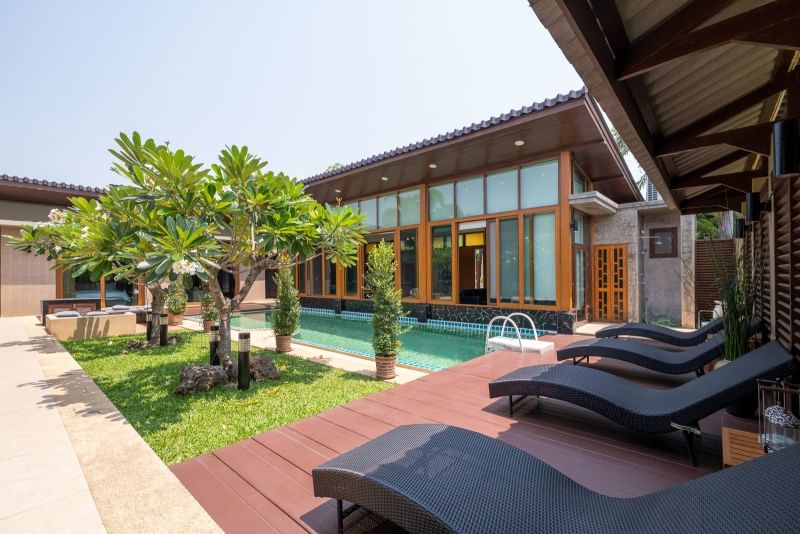 เลานจ์สระว่ายน้ำไม้สักขนาดใหญ่ 4 แห่ง และพื้นที่กว้างขวางสำหรับการรับประทานอาหารกลางแจ้ง เป็นสถานที่ที่สมบูรณ์แบบสำหรับความบันเทิงและการทำบาร์บีคิว