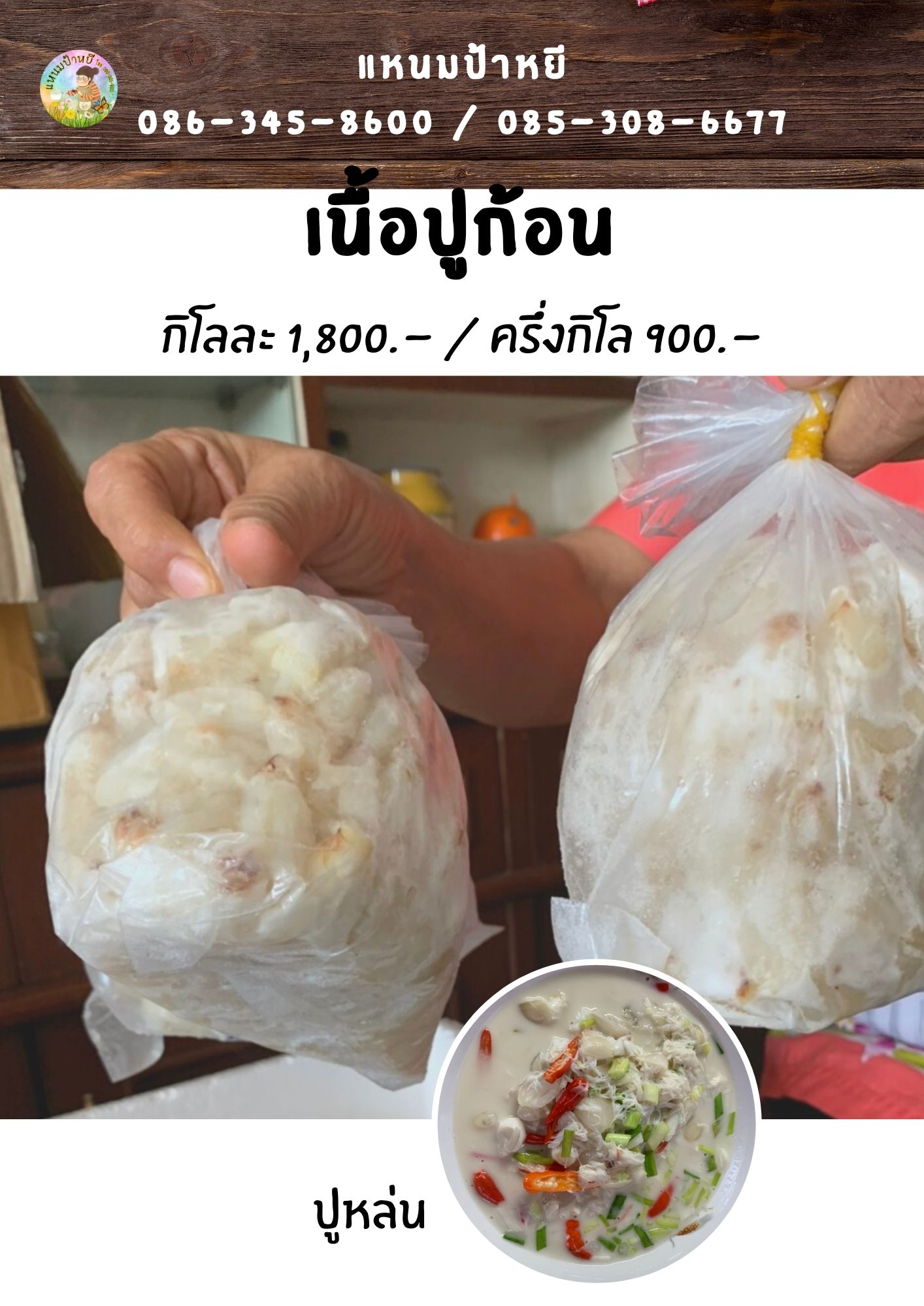 เนื้อปูก้อน สดๆ เนื้อแน่นๆ เนื้อเน้นๆ กิโลละ 1,800 บาท ครึ่งกิโล 900 บาท สั่งซื้อโทร. 086-345-8600 ,085-308-6677 ติดตามเพจ Facebook : https://www.facebook.com/naempayhee