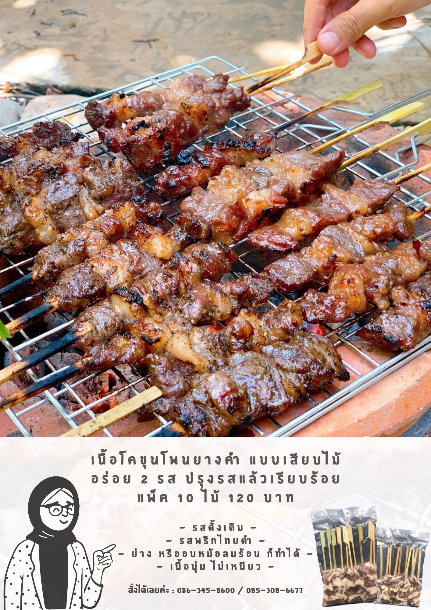 เนื้อโคขุนโพนยางคำ แบบเสียบไม้ ร้านแหนมป้าหยี สั่งได้ค่ะ