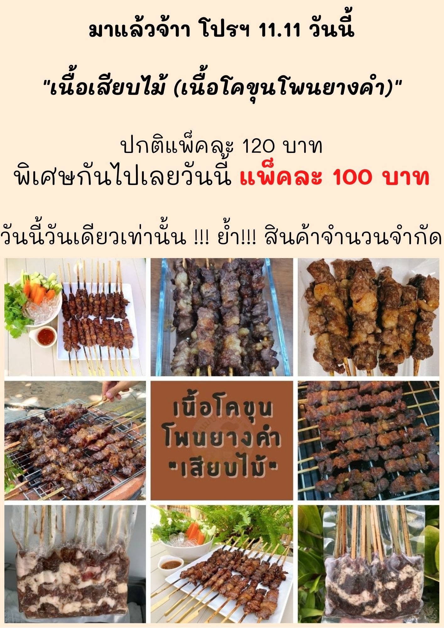 มาแล้วจ้าา โปรฯ 11.11 วันนี้ "เนื้อเสียบไม้ (เนื้อโคขุนโพนยางคำ)" ปกติแพ็คละ 120 บาท พิเศษกันไปเลยวันนี้ แพ็คละ 100 บาท วันนี้วันเดียวเท่านั้น !!! ย้ำ!!! สินค้าจำนวนจำกัด