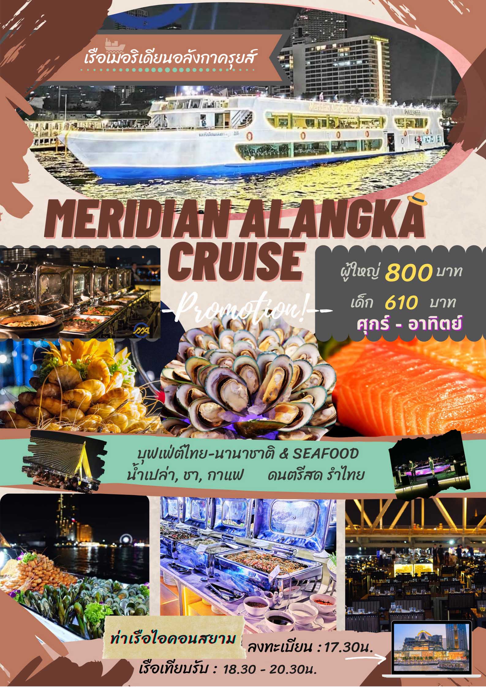 wisplanetMeridian Alangka Cruiseวันศุกร์ - อาทิตย์ผู้ใหญ่ ท่านละ 800 บาทเด็ก 4-10 ขวบ ท่านละ 610 บาทบุฟเฟ่ต์นานาชาติ & ซีฟู้ดเครื่องดื่ม น้ำเปล่า ชา กาแฟท่าเรือ ไอคอนสยามลงทะเบียน 17.30น.รอบเวลาล่องเรือ 18.30-20.30 น.