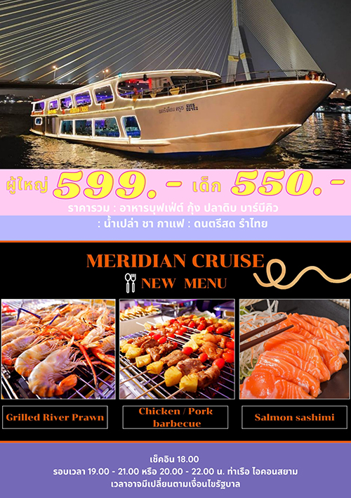 wisplanetเรือเมอริเดียนครุยส์ Voucher โปรโมชั่นสุดคุ้มราคาพิเศษ ผู้ใหญ่ 599 บาทราคาพิเศษ เด็ก 4-10 ขวบ 550 บาท เมนูอาหาร : บุฟเฟ่ต์นานาชาติเครื่องดื่ม : ชา น้ำเปล่า กาแฟการแสดง : ดนตรีสด
