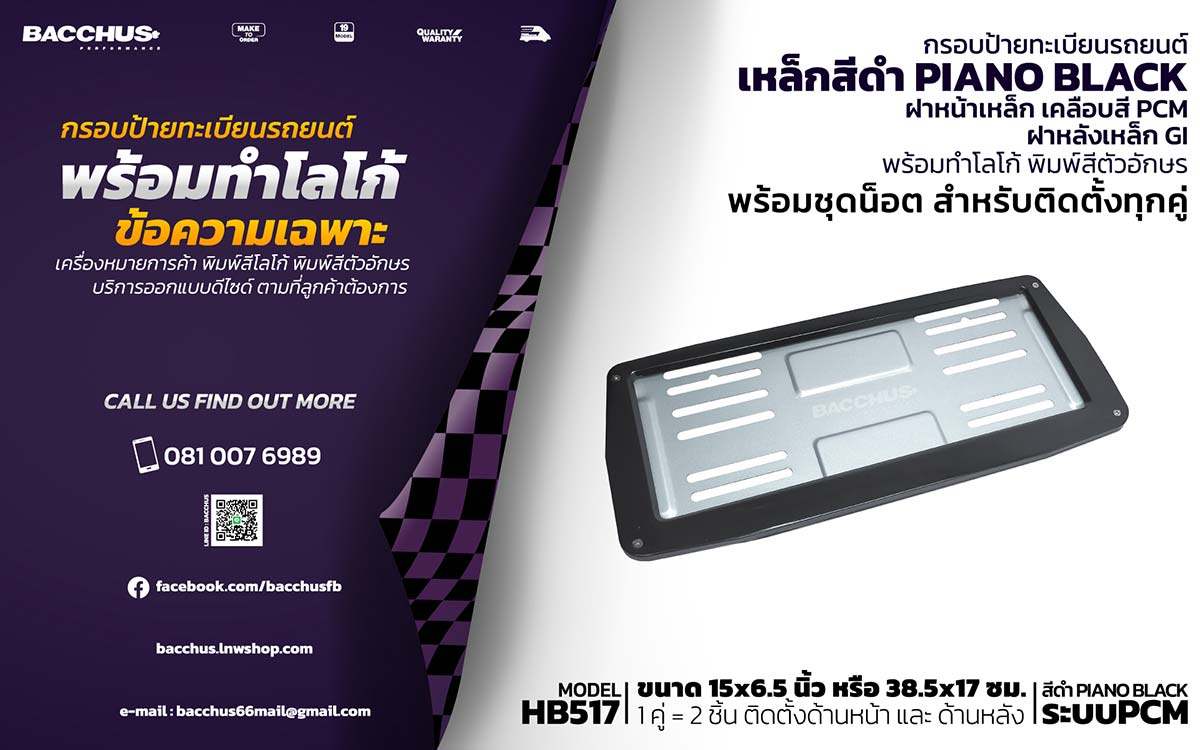 • กรอบป้ายทะเบียนรถยนต์ เหล็กสีดำ PIANO BLACK เคลือบสี PCM