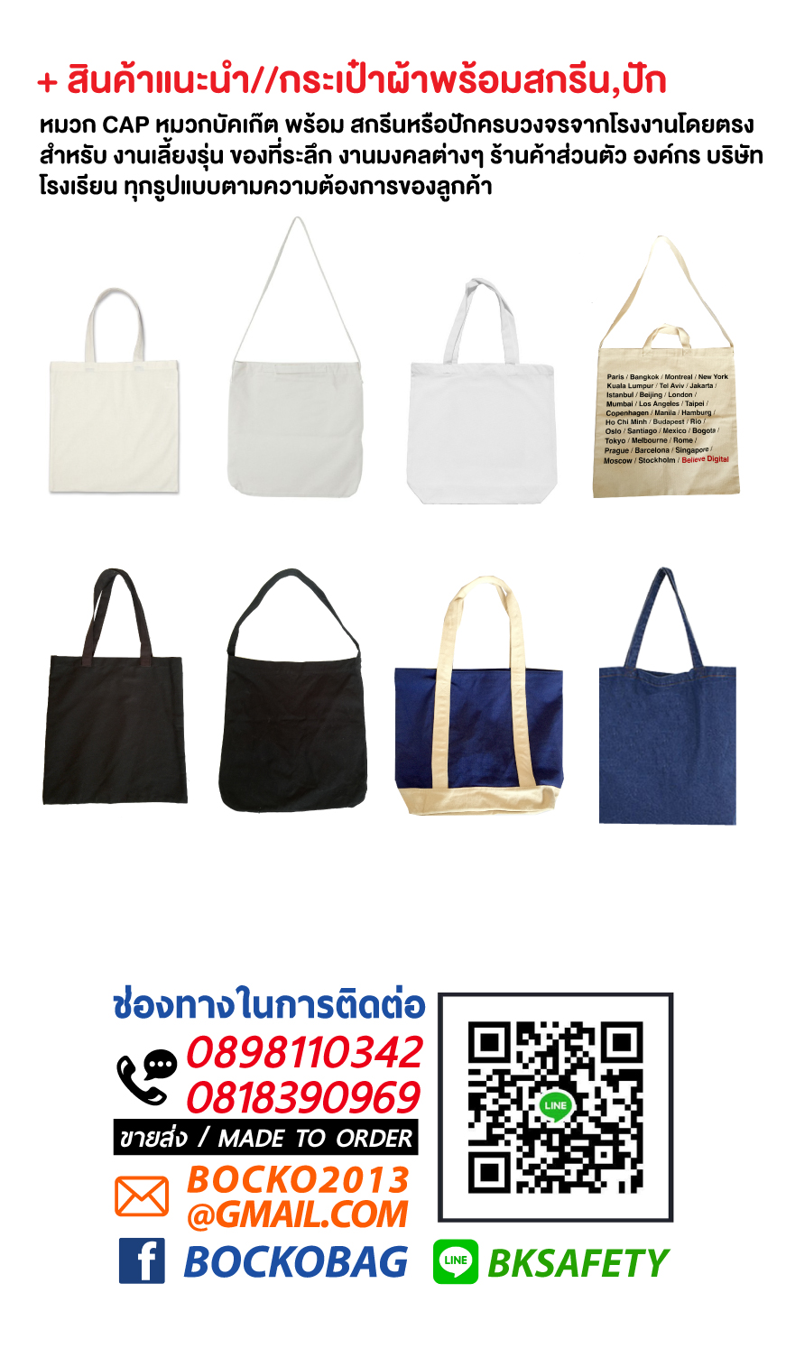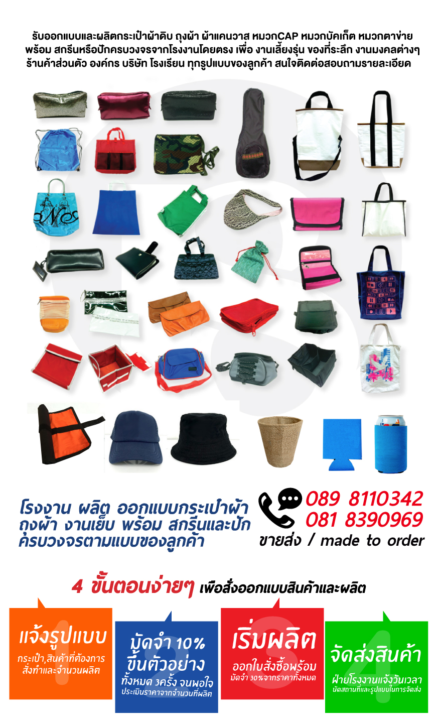 รับออกแบบและผลิตกระเป๋าผ้าดิบ ถุงผ้า ผ้าแคนวาส หมวกcap หมวกบักเก็ต หมวกตาข่ายพร้อมสรีนหรือปักแบบครบวงจรจากโรงงานโดยตรง เพื่องานเลี้ยงรุ่น ของที่ระลึก งานมงคลต่างๆ ร้านค้าส่วนตัว องค์กร บริษัท โรงเรียน ทุกรูปแบบของลูกค้า สนใจติดต่อสอบถามรายละเอียด