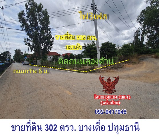 บ้านดี พารวยขายที่ดินเปล่า เนื้อที่ 302 ตารางวา ต.บางเดื่อ อ.เมืองปทุมธานี ถนนกรุงเทพปทุมธานี เส้น 307 (เข้าซอยวัดหนองปรง 1.6 ก.ม.)