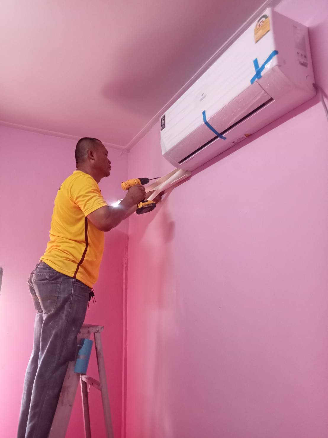 แอร์สกปรก ทำการล้างแอร์ด้วยปั๊มแรงดันสูง ข้อต่อท่อน้ำทิ้งหลุด ทำการตรวจเช็คหาจุดที่หลุด