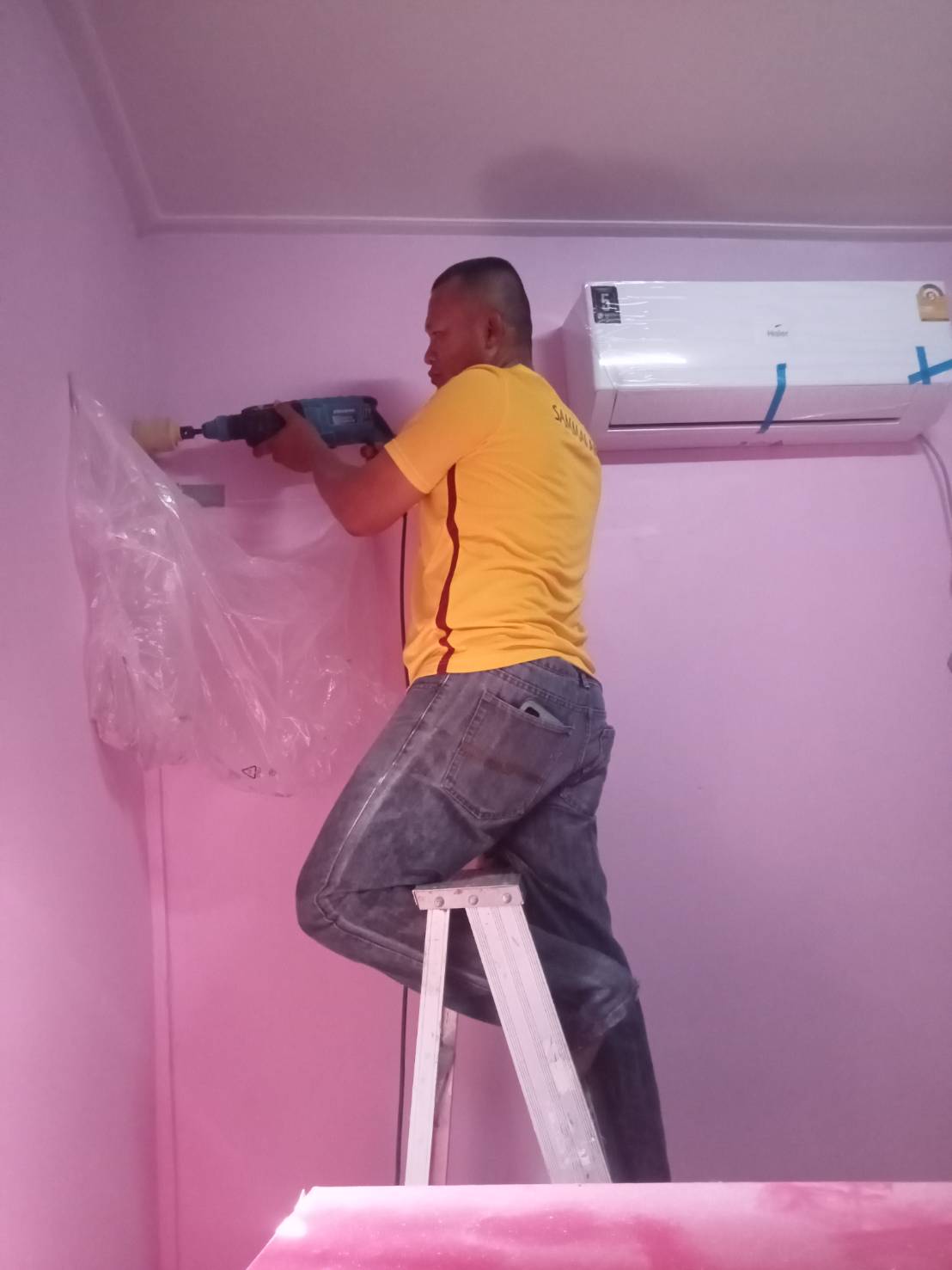 ท่อน้ำทิ้งตัน ทำการฉีดไล่ด้วยปั๊มแรงดันสูง แอร์มีกลิ่นอับชื้น ในห้องมีความชื้นสูง ตั้งโหมดลด