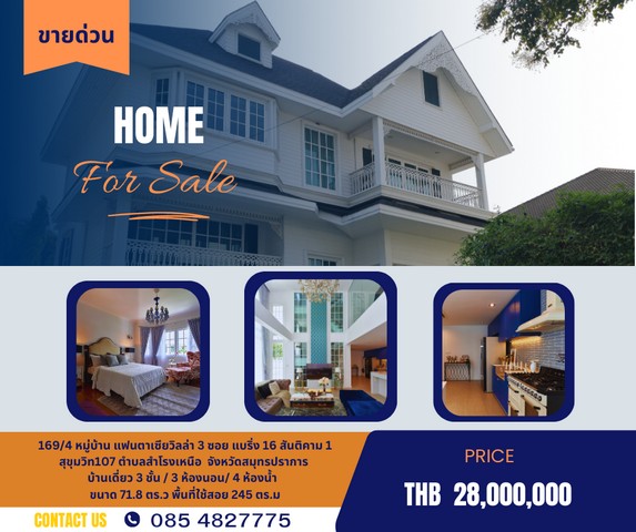 Postprakard.shop Propertyขายบ้านเดี่ยว ม. แฟนตาเซีย วิลล่า 3 ซอย แบริ่ง 16 สันติคาม 14 สุขุมวิท107 สำโรงเหนือ สมุทรปราการ ขนาด 71.8 ตรว. หลังริม ขาย 28 ล้าน ขายพร้อมผู้เช่า