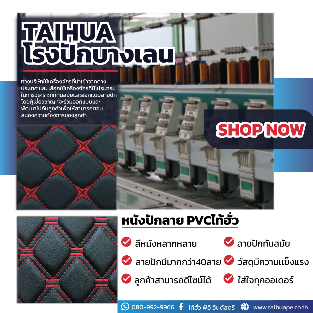 บริษัท ไท้ฮั่ว พีอี อินดัสตรี จำกัด เป็นผู้ผลิตและให้บริการในด้านหนังPVCปักลาย อาทิเช่น บริการปักลายหนังPVC,ปั๊มลายหนังPVC,บริการลามิเนต, การลามิเนตXPE, การลามิเนตกาว,บริการตัดผ้ากุ๊นและยังเป็นผู้จัดจำหน่ายวัตถุดิบพร้อมใช้งาน อาทิเช่น หนังPVCปักลาย,พรมไวนิล,พรมดักฝุ่น,ด้าย