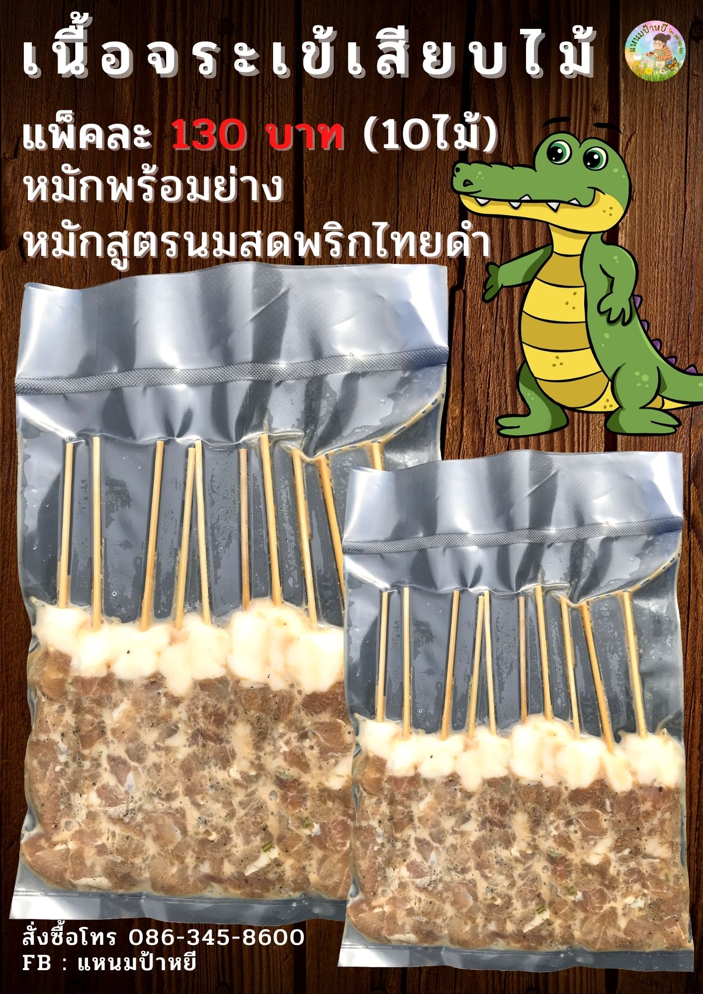 เนื้อจระเข้เสียบไม้ หมักสูตรพริกไทดำนมสด