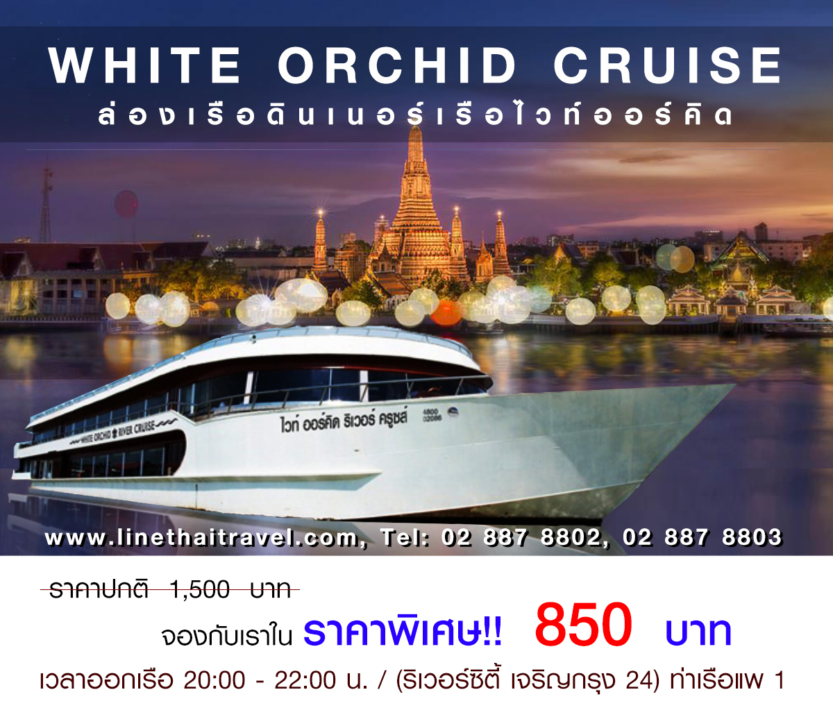 คลิ๊กดูรายละเอียด http://www.linethaitravel.com/ล่องเรือดินเนอร์-แม่น้ำเจ้าพระยา/เรือไวท์ออร์คิด-ริเวอร์-ครูซส์-White-Orchid-River-Cruise.html