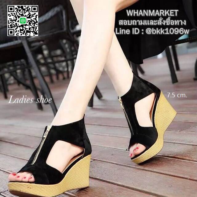WhanMarketรองเท้าส้นเตารีดทรงบูทเปิดหน้า วัสดุหนังกลับ ซิปหน้า ใส่ง่าย พื้นปั้มลายสาน ส้นสูง 7.5 cm กำลังดีใส่สบายกระชับเท้าขาเรียวสวย