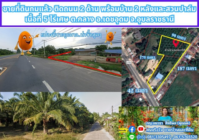 เทเรซา สิทธิพล ขายที่ดินติดถนนสาธารณะ 2 ด้าน ด้านหน้าติดถนนทางหลวง ชื่อถนนเดชอุดม-อุบล ขนาด 4 ช่องจราจร ส่วนด้านข้างติดถนนซอยสาธารณะ ถนนกว้าง 6 เมตร ทำด้วยคอนกรีต