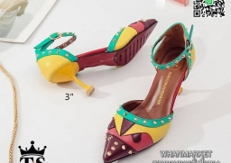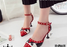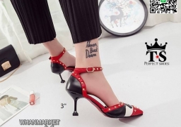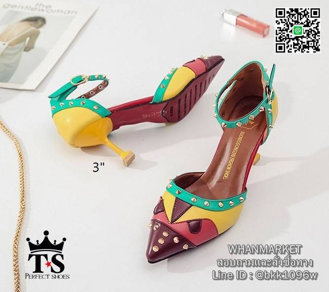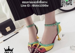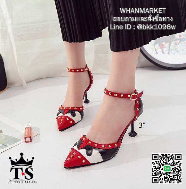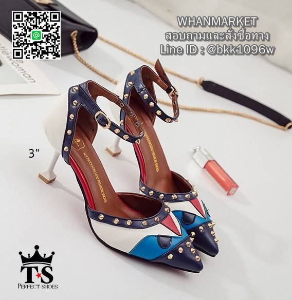 WhanMarketรองเท้าส้นเข็มแฟชั่น วัสดุหนังตัดลาย แต่งมุดสีทอง เกร๋ๆ ทรงหัวแหลม รัดข้อเท้าตะขอเกี่ยวปรับระดับได้ แมทง่าย ใส่สวย สาวแซ่บ สาวอินเทรน ฟาดด่วนเลยค่า!!