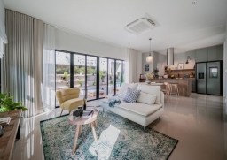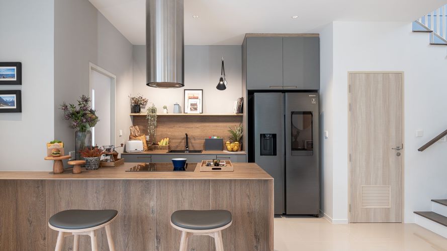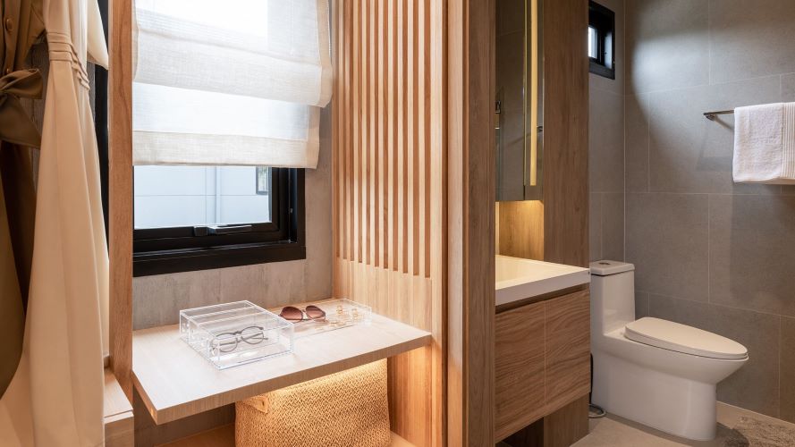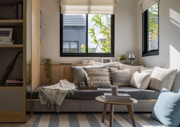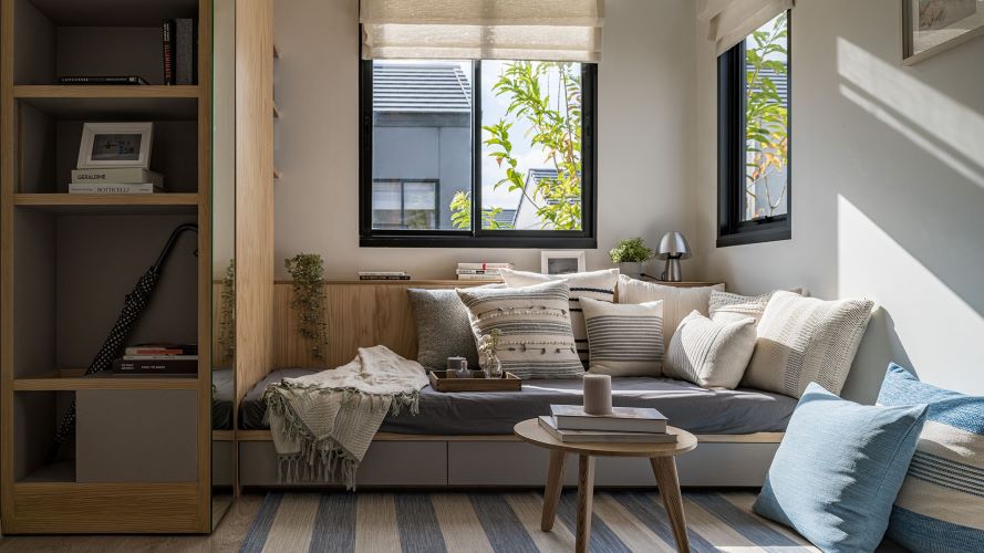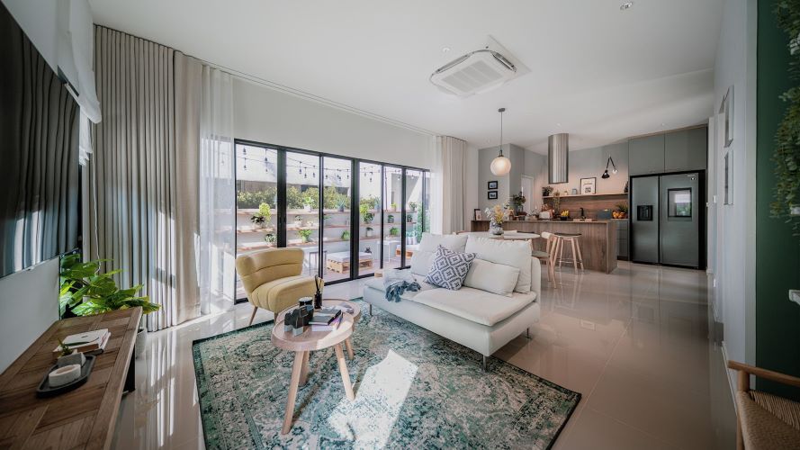 ห้องนั่งเล่น เป็นลักษณะ Open plan เปิด โล่ง โปร่ง สบายตา มีแสงธรรมชาติเยอะ เชื่อมกับพื้นที่เฉลียงด้านหลัง เปิดรับวิวสวนด้านหลังบ้าน ทำให้ห้องนั่งเล่นโปร่งโล่ง นอกจากจะรับวิวสวนแล้ว ยังสามารถเปิดถ่ายเทอากาศภายในบ้าน และรับแสงธรรมชาติได้เต็มที่