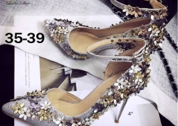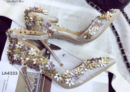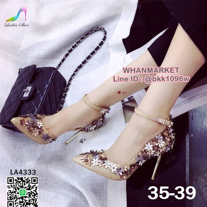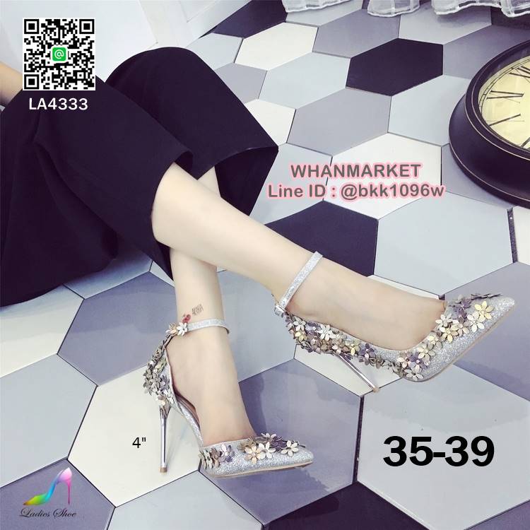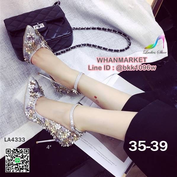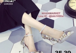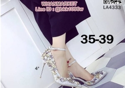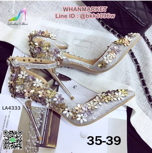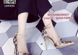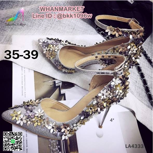 WhanMarketรองเท้าคัชชู ส้นเข็มแฟชั่น ทรงหัวแหลม วัสดุหนังกริตเตอร์ แต่งหมุดดอกไม้ รัดข้อ ส้นเข็มสูง 4 นิ้ว ทรงสวย ใส่ออกงาน ดูโดดเด่นมากค่ะ