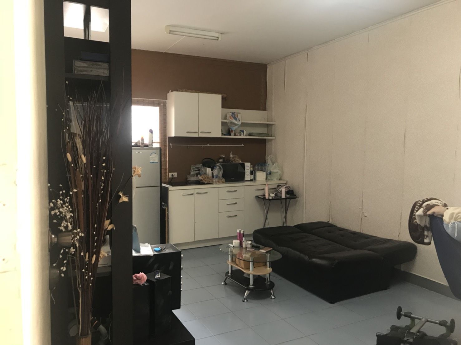 - ระเบียงหลังห้องปูกระเบื้องแกรนิตโต้สีเทาเข้มอย่างดี+ติดตั้งเครื่องกรอกน้ำอยู่ด้านหลัง
