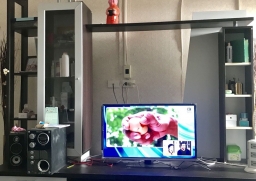 - ชั้นวางโทรทัศน์ขนาดใหญ่ + โซฟาปรับนอนได้ + โต๊ะกลางกระจก