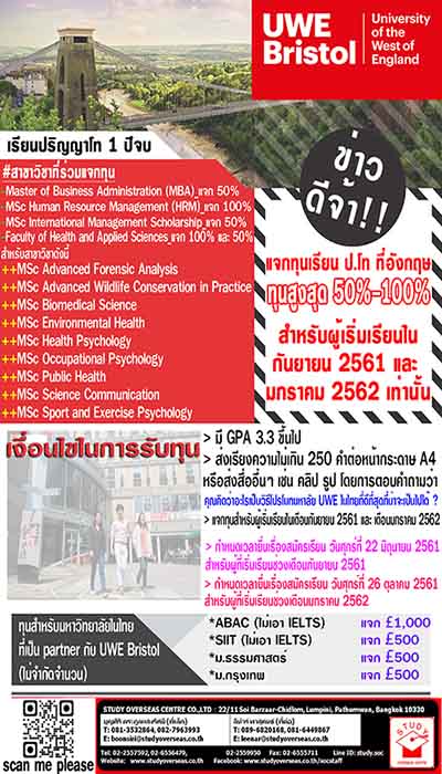 University of the West of England (UWE Bristol) เป็นสถาบันอุดมศึกษาขนาดใหญ่ใน UK ก่อตั้งขึ้นเมื่อ พ.ศ. 2513 ที่เมือง Bristol ซึ่งอยู่ทางเหนือตอนตะวันตกเฉียงใต้ของประเทศอังกฤษ เปิดโครงการแจกทุนเรียน ป.โท แบบจัดหนักถึง 50%-100% ให้น้องๆไปเรียนต่อ ป.โทที่อังกฤษแบบสบายกระเป๋าที่สุด!