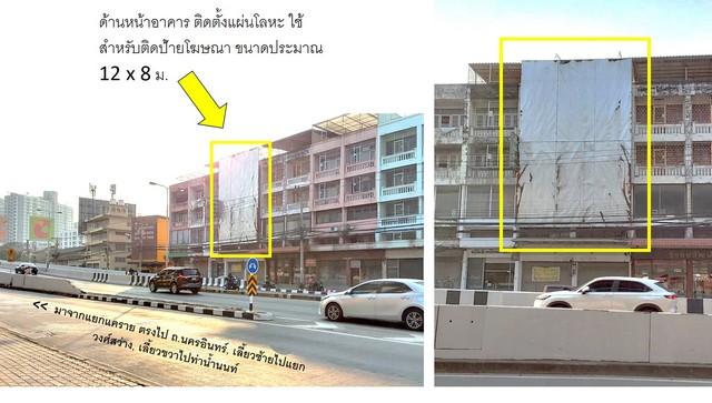 - ด้านหน้าอาคารติดตั้งแผงป้ายโลหะ (ขนาดประมาณ12 x 8 เมตร) สามารถใช้ติดแบนเนอร์โฆษณาได้เลย