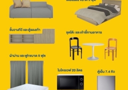 เตียงพร้อมฟูกที่นอนขนาด 5 ฟุต 1 ชุด โซฟา ชั้นวางทีวี โต๊ะทานข้าว ผ้าม่าน 1 ชุด Digital door lock