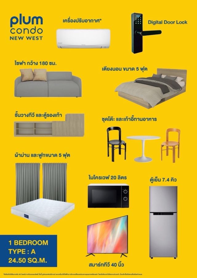 ทีวี ขนาด 40 นิ้ว จำนวน 1 เครื่อง , ตู้เย็น ขนาด 7.4 คิว จำนวน 1 เครื่อง , เตาไมโครเวฟ ขนาด 20 ลิตร จำนวน 1 เครื่อง