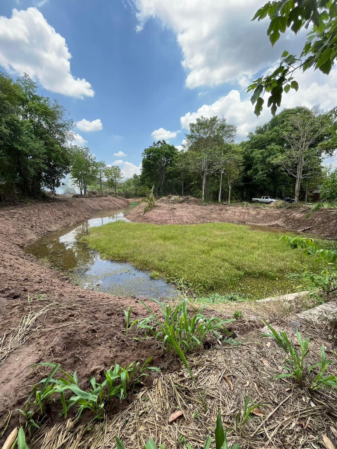 - มีฝายกั้นน้ำกลางแปลงที่ดิน, มีลำธารด้านข้าง และกลางแปลงที่ดิน