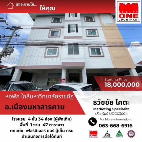 หอพักทำเลทอง ใกล้มหาวิทยาลัยราชภัฏมหาสารคาม 4 ชั้น 34 ห้อง