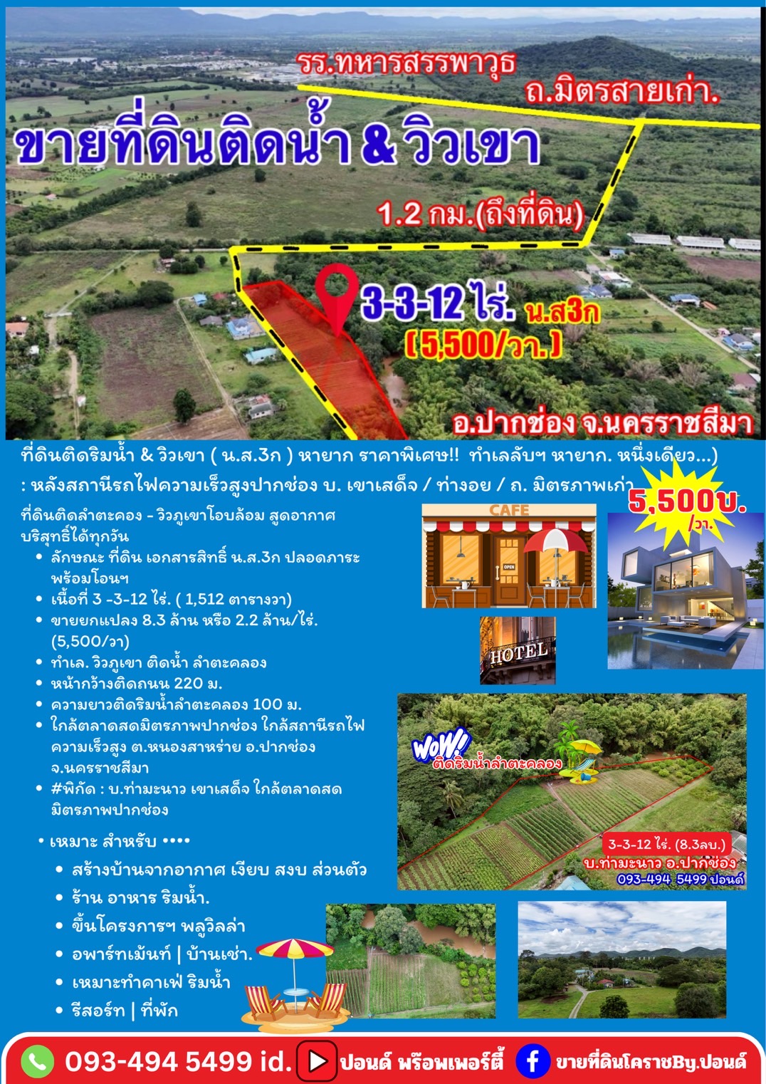 ที่ดินติดริมน้ำวิวเขาปากช่อง.( 3-3-12 ไร่.)( 5,500 บ./ตร.วา ) | ( น.ส.3ก ) หายาก ราคาพิเศษ!!