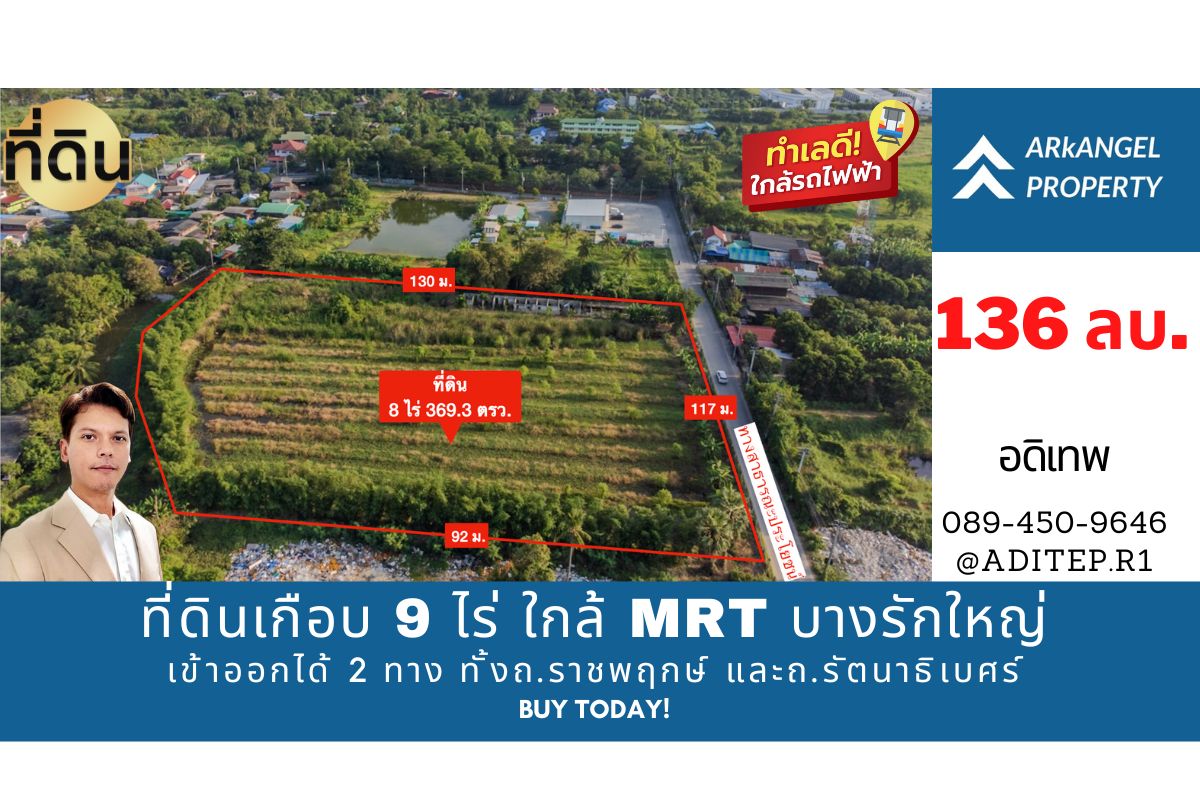 อดิเทพ ภระมรทัตขายที่ดินราชพฤกษ์ เกือบ 9 ไร่ ที่ดินใกล้รถไฟฟ้าสายสีม่วง สถานีบางรักใหญ่ บางบัวทอง เข้าออกได้ 2 ทาง ทั้งทางถนนรัตนาธิเบศร์ และถนนราชพฤกษ์