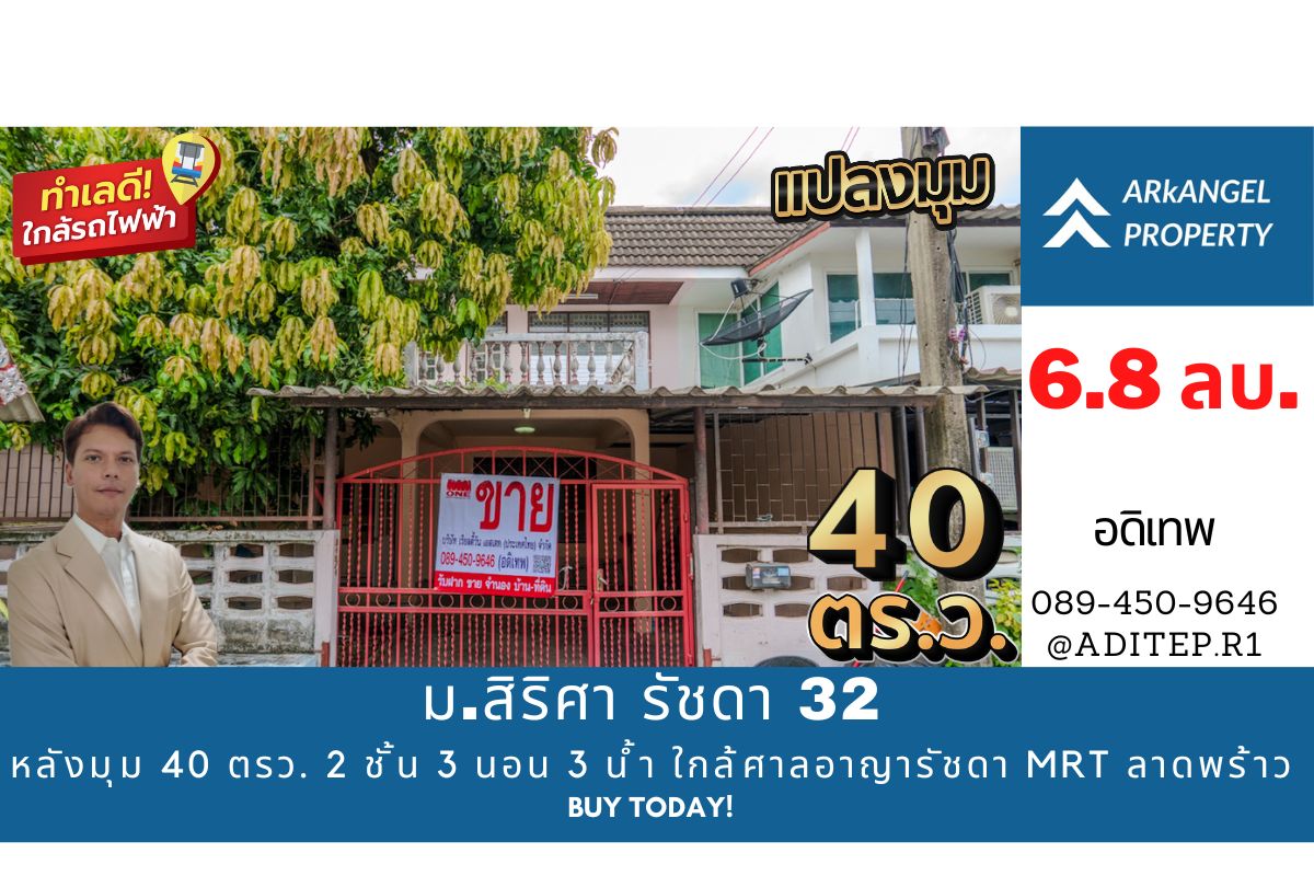 อดิเทพ ภระมรทัตทาวน์เฮ้าส์หลังใหญ่ 40 ตรว. หมู่บ้านสิริศา รัชดา 32 ซอยตรงข้ามศาลอาญารัชดา ใกล้ MRT ลาดพร้าว หลังมุม 3 ห้องนอน 3 ห้องน้ำ