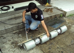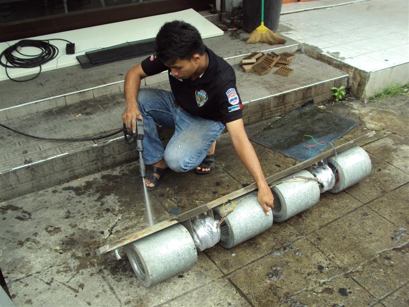 ใช้ปั้มน้ำแรงดันสูงฉีดอัดล้างท่อน้ำทิ้ง และชิ้นส่วนต่างๆ อย่างละเอียด