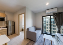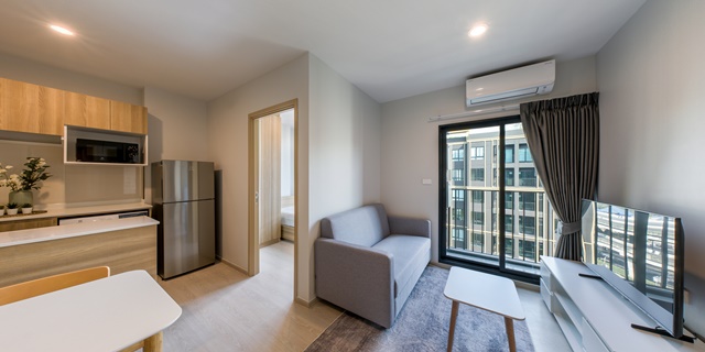 Phahonyothin 79 Nue Connex Donmueang, a new condo on Vibhavadi Rangsit Road, located near Don Mueang Airport, convenient for both car and train travel. This 2-bedroom, 1-bathroom unit is 35 sq m. on the 7th floor of Building C7. Rent is 12,999-13,499 baht per month. The room is ready to move in. The atmosphere is quiet and private, with a large common area of the project.