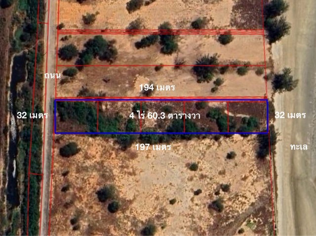 เนื้อที่ 4 ไร่ 60 ตารางวา ติดทะเลหน้ากว้าง 32 เมตร ยาว197 เมตร ติดถนน 2 ด้าน เป็นแหล่งท่องเที่ยว