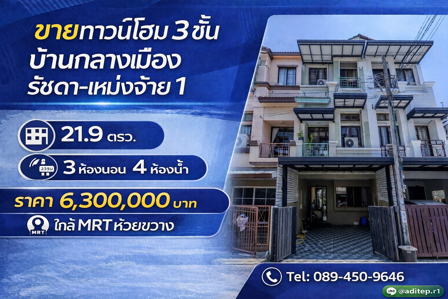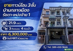 อดิเทพ ภระมรทัตขายทาวน์โฮม 3 ชั้น บ้านกลางเมือง รัชดา-เหม่งจ๋าย 1 ขนาด 21.9 ตรว. 3 ห้องนอน 4 ห้องน้ำ ทำเลใจกลางเมือง ใกล้ MRT เหมาะทั้งอยู่อาศัย ลงทุนปล่อยเช่า หรือเปิดโฮมออฟฟิศ
