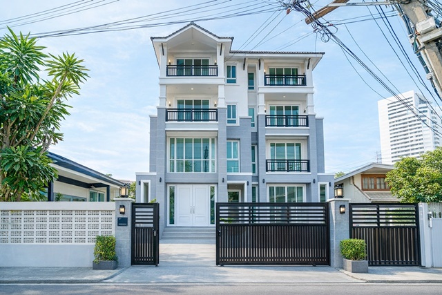 Ekamai 10-12 BTS Ekkamai2 km. 3.5-story townhome with mezzanine 3 bed 3 bath . 27 sq.wa. 340 sq.m. usable area 71,999 B-M. per unit. Located on Pridi Banomyong Road Ekkamai area suitable for home office residence or AirBnB in a lush safe environment close to St. Andrews International School 1.9 km. and Sukhumvit lifestyle hub.