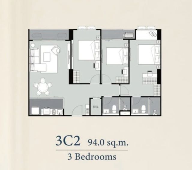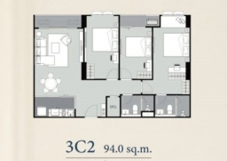 เนื้อที่ 93.5 0 ตรม. 3 ห้องนอน 2 ห้องน้ำ ชั้น9 ทิศใต้ (ตำแหน่ง06) ไม่มีตึกบังเต็มความกว้างของยูนิต ตำแหน่งห้องนี้หันทิศใต้และเป็นวิวโล่งตลอดไป