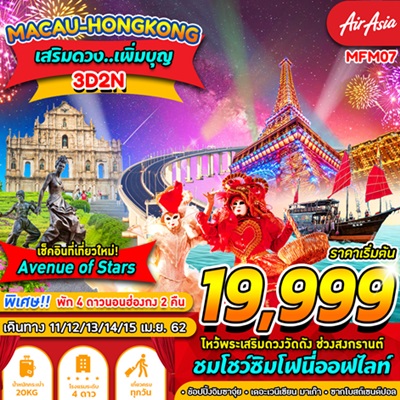 สายการบิน Air Asia เดินทาง 11/12/13/14/15 เม.ย. 62 ราคา 19,999 บาท ทัวร์ฮ่องกง มาเก๊า ไหว้พระเสริมดวงวัดดัง ช่วงสงกรานต์ ชมโชว์ซิมโฟนี่ออฟไลท์ เช็คอินที่เที่ยวใหม่! Avenue of Stars ช้อปปิ้งจิบชาจุ่ย เดอะเวเนเชี่ยน มาเก๊า ซากโบสถ์เซนต์ปอล พิเศษ!! พักโรงแรมหรู 4 ดาว นอนฮ่องกง 2 คืน