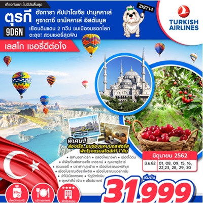 สายการบิน Turkish Airlines เดินทาง มิ.ย. - ก.ค.62 ราคาเริ่มต้น 31.999 บาท อังการา คัปปาโดเจีย ปามุคคาเล่ คูซาดาซี ชานัคคาเล่ อิสตันบูล เยือนดินแดน 2 ทวีป ชมเมืองมรดกโลก ตะลุย! สวนเชอรี่สุดฟิน พิเศษ!! ล่องเรือ ชมช่องแคบบอสฟอรัส พักโรงแรมสไตล์ถ้ำ 1 คืน