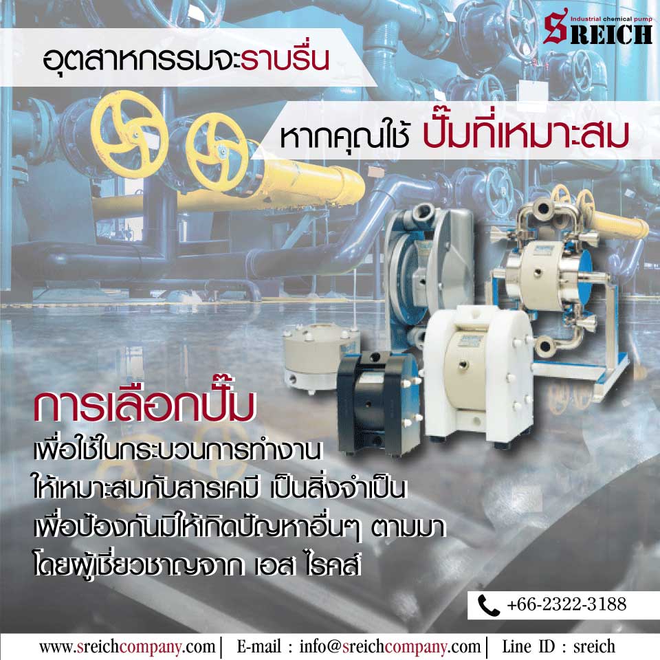 sreich companyปั๊มเคมีที่ เอส ไรคส์ คัดสรรมาให้ลูกค้ามีหลากหลาย เพื่อให้เหมาะแก่การใช้งานในอุตสาหกรรมต่างๆ เช่น ปั๊มไดอะแฟรม ปั๊มเซนติฟูกัลหรือปั๊มหอยโข่งแบบดูดจากก้นถัง หรือแบบจุ่มในบ่อ ปั๊มแมคเนติคไดร์ (Magnetic driven pump) ปั๊มมิเตอร์ริ่งหรือปั๊มโดส ปั้มจ่ายสารละลายเคมีต่างๆ รวมถึงอุปกรณ์ควบคุมการทำงานของปั๊มโดส และเซนเซอร์วัดสารเคมีในน้ำ เช่น เซนเซอร์วัดคลอรีน วัดค่ากรดด่างในน้ำ วัดค่าเหนี่ยวนำไฟฟ้า การเลือกปั๊มเพื่อใช้ในกระบวนการทำงานให้เหมาะสมกับสารเคมี เป็นสิ่งจำเป็นเพื่อป้องกันมิให้เกิดปัญหาอื่นๆ ตามมา