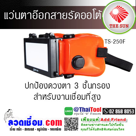 ตุ๊กตา วิษณุราชันต์แว่นตาอ๊อกสายรัดออโต้ เดอะซัน รุ่น TS-250F เหมาะสำหรับการใช้งาน กระบวนการเชื่อมแก๊ส เชื่อมไฟฟ้า และสะดวกต่อการปีนป่ายเชื่อมในที่สูง ด้วยน้ำหนักเพียง 180 กรัม โครงหน้ากากผลิตจาก พีวีซี ชนิดนุ่ม กระชับใบหน้า มีรูระบายอากาศ 6 จุด ช่วยป้องกันการเกิดฝ้าและระบายความร้อน ฝากรอบสี่เหลี่ยม เปิด-ปิด ผลิต จากโพลีคาร์บอเนตเคลือบแข็ง พร้อมเลนส์ 2 ชั้น กระจกปรับแสงเป็นแบบออโต้ มี 2 เซนเซอร์ แหล่งจ่ายไฟสามารถใช้ได้ทั้ง 2 แบบ คือ 1.แหล่งจ่ายไฟจากแผงโซล่าเซลล์ และ 2. แบตเตอรี่ลิเธียมชนิดถอดสับเปลี่ยน ทำให้ยืดอายุการใช้งานได้อย่างต่อเนื่อง