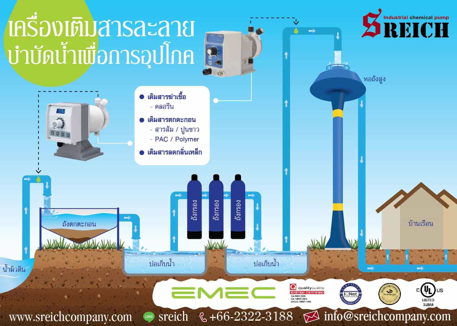 น้ำใสจะไหลออกจากถังตกตะกอนเข้าสู่ถังกรอง ในขณะเดียวกันจะมีการจ่ายสารละลายคลอรีน เพื่อฆ่าเชื้อโรคในอัตราส่วนที่พอเหมาะแล้วนำไปเก็บไว้ในถังน้ำใสเพื่อรอการสูบจ่าย ซึ่งในกระบวนการสูบจ่ายสารละลายเคมีควรใช้ปั๊มที่มีคุณภาพ และมีอัตราการจ่ายน้ำยาที่แม่นยำ หัวปั๊มทำจากวัสดุทนเคมีกัดกร่อน คุณภาพเยี่ยม แบรนด์ EMEC ผลิตจากประเทศอิตาลี นำเข้าโดย บริษัท เอส ไรคส์ จำกัด ตัวแทนจำหน่ายปั๊มเคมีจากยุโรปในประเทศไทย