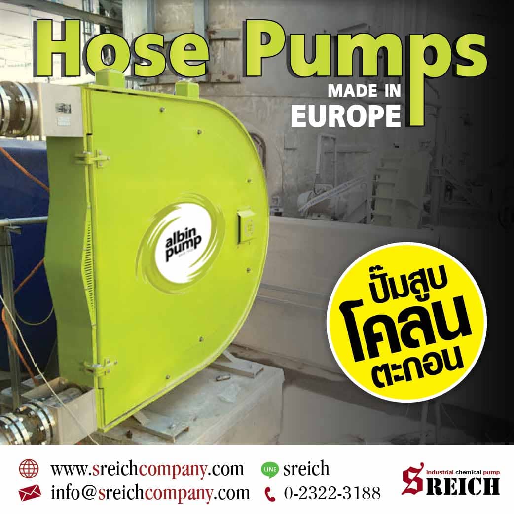 sreich companyในกระบวนการขนถ่ายของเหลวที่มีความหนืด จำเป็นต้องใช้ปั๊มที่มีแรงดันสูงในการขนถ่าย ซึ่งปั๊มรีดท่อ หรือโฮสปั๊ม แบรนด์ Albin จากประเทศฝรั่งเศส ใช้สูบ-จ่าย ขนถ่ายของเหลวที่มีความหนืด มีตะกอนปน ได้ เช่น กากตะกอนน้ำเสีย ที่มีความหนืดถึง 60,000 cps หรือโคลนปริมาตร 800 กรัม/ลิตร เป็นต้น วัสดุหัวปั๊มมีหลากหลายรุ่นเพื่อความทนทานต่อการกัดกร่อนของสารเคมีหรือของเหลว ของหนืด ตัวปั๊มได้รับการรับรองมาตรฐาน ATEX ป้องกันการจุดติดระเบิดจากยุโรป ส่วนการทำงานสามารถทำงานได้ต่อเนื่องเมื่อน้ำแห้ง (run dry) โดยไม่เกิดความเสียหาย