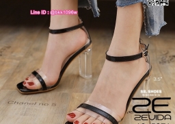 รองเท้าส้นแก้ว สูง 3.5 นิ้ว วัสดุPU คาดหน้าอคิลิคนิ่ม รัอข้อตะขอเกียว