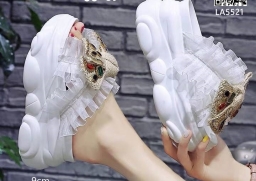 รองเท้าส้นขนมปังสูง 9cm. พื้นนุ่ม สายหนังPU ไขว์ แต่งระบายผ้าซีฟอง เสริมโบว์ ติดคริสตัล