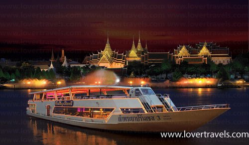 19.30 น. เชิญท่านลงเรือ บริการเครื่องดื่มต้อนรับ (Welcome Drink) อิ่มอร่อยกับอาหารบุฟเฟ่ต์นานาชาติรสเลิศ โดยฝีมือพ่อครัวชั้นนำ เคล้าคลอด้วยเสียงเพลงอันไพเราะ จากวงดนตรีบรรเลงขับกล่อมระหว่างรับประทานอาหาร และสนุกสนานเพลิดเพลินกับการแสดงบนเรือที่เตรียมไว้สำหรับท่านโดยเฉพาะเส้นทางล่องเรือ ผ่านสถานที่สำคัญที่น่าสนใจ ดังนี้ ป้อมวิชัยประสิทธิ์ วัดกัลยาณมิตร พระปรางค์วัดอรุณฯ พระบรมมหาราชวัง พระที่นั่งสันติชัยปราการ สะพานพระรามแปด ฯลฯ