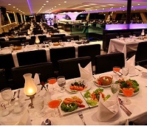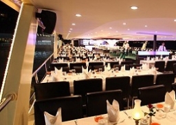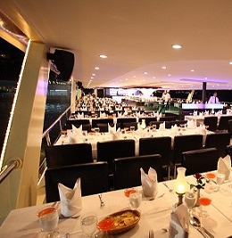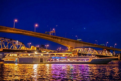 19.30 น. เชิญท่านลงเรือ บริการเครื่องดื่มต้อนรับ (Welcome Drink) อิ่มอร่อยกับอาหารบุฟเฟ่ต์นานาชาติรสเลิศ โดยฝีมือพ่อครัวชั้นนำ เคล้าคลอด้วยเสียงเพลงอันไพเราะ จากวงดนตรีบรรเลงขับกล่อมระหว่างรับประทานอาหาร และสนุกสนานเพลิดเพลินกับการแสดงบนเรือที่เตรียมไว้สำหรับท่านโดยเฉพาะเส้นทางล่องเรือ ผ่านสถานที่สำคัญที่น่าสนใจ ดังนี้ ป้อมวิชัยประสิทธิ์ วัดกัลยาณมิตร พระปรางค์วัดอรุณฯ พระบรมมหาราชวัง พระที่นั่งสันติชัยปราการ สะพานพระรามแปด ฯลฯ