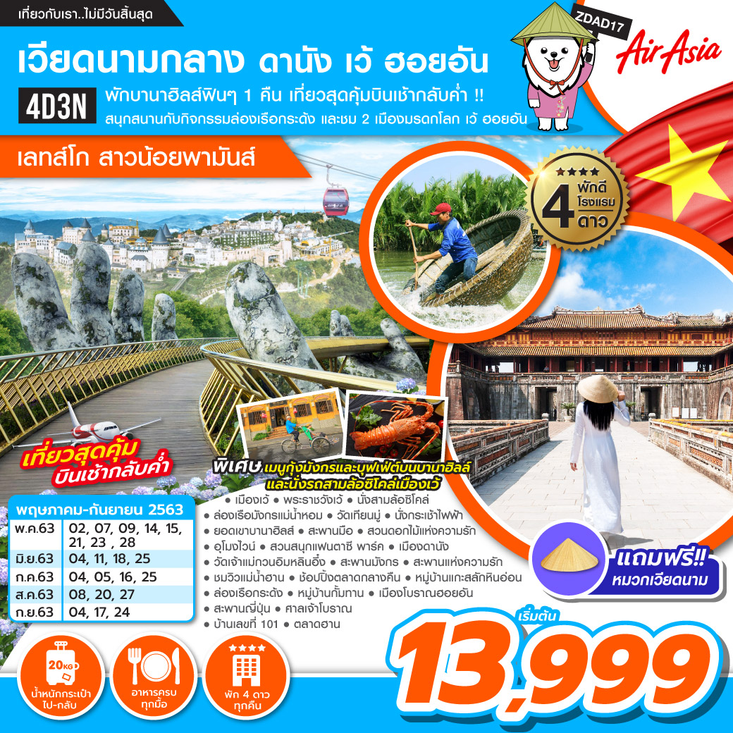 มาลินี พ้นภัยพาลสายการบินไทยแอร์เอเชีย เดินทาง พ.ค.- ก.ย.63 ราคาเริ่มต้น 13,999 บาท พักบานาฮิลล์ฟินๆ 1 คืน เที่ยวสุดคุ้มบินเช้ากลับค่ำ สนุกสนานกับกิจกรรมล่องเรือกระด้ง และชม 2 เมืองมรดกโลก เว้ ฮอยอัน พิเศษ เมนูกุ้งมังกรและบุฟเฟ่ต์บนบานาฮิลล์ และนั่งรถสามล้อซิโคล่เมืองเว้